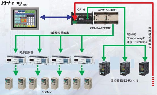 在蒸化机控制系统中,我们采用了欧姆龙高性能小型PLC CP1H,通过4路模拟量输出模块连接同步控制器来控制欧姆龙3G3MV系列变频器。蒸化机烘房温度控制采用了欧姆龙公司的温控器E5EZ,通过Compo Way/F通信协议(速度112kbps)直接和CP1H的RS-485口通讯,PLC可以直接改变E5EZ的控制参数并实时监控。人机界面使用欧姆龙公司10.4” 彩色触摸屏NT631C,进行参数和工作流程的监控。