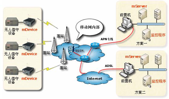 | 概述 本文探讨利用GPRS/CDMA网络对无人值守设备进行远程无线监控的方案。 无人值守设备的稳定使用、售后支持、新版本更新一直是费时费力的难题,本方案提供一种安装简单,节省人力物力的远程监控和维护的方案,即通过GPRS/CDMA无线网络进行无人职守设备的远程监控。 2系统结构
