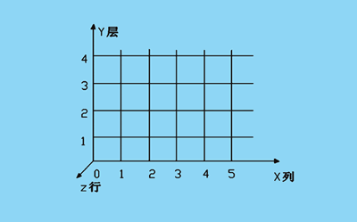 堆垛机自动存取时,必须确定要存或取的货物在货架上的位置,即定位。货物放在货架上的托盘里,一旦托盘所在层、列、行确定,则堆垛机在控制器控制下可自动对托盘进行操作。设层为Y坐标,列为X坐标,行为Z坐标,其立体库定位示意图见图1。