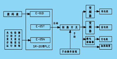 为了保障立体库的正常工作,立体库PLC控制系统设计成自动和手动两种方式,当自动出现故障时,手动可继续工作。本系统工作在自动方式时,堆垛机的三个自由度由三种不同电机驱动(列电机、层电机、叉电机)。为了提高效率,同时能够做到堆垛机正确动作,层电机和列电机由变频器驱动。当堆垛机运行到层或列的目标前一单元,驱动层电机的变频器或驱动列电机的变频器开始降速,一旦检测到目标位光电信号,则驱动层电机的变频器或驱动列电机的变频器在PLC的控制下正确停车。根据Z值,堆垛机的货叉左出或右出。至于存或取时的微落或微抬,由于贮存单元(托盘)规格一样,故只要知道存还是取,控制系统自动进行微落或微抬。当堆垛机的货叉在目标位工作完后,堆垛机自动返回原位,完成整个存或取过程结束。系统框图见图3。考虑到该立体库为冷库,到了冬天,控制系统环境不能满足PLC控制器要求,为此增设了加热控制装置,确保PLC控制器可靠。