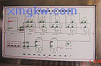 | 控制部分采用台湾永宏产品FBS系列PLC,研华工控机,21寸三星彩显,A4幅面激光打印机,5台电器控制柜和(2.0m*4.0m)马赛克模拟屏组成 |