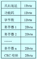 在命令帧中,寄存器起始地址是告诉Delcos3100控制器,CP341模块要读取的寄存器的起始地址;寄存器数是指从起始地址开始连续读取的寄存器值的个数;CRC校验是指对从站地址及其以后部分在命令帧中所占的字节数进行CRC-16校验所生成的校验码。 Delcos3100控制器上传的应答帧格式如图3所示。