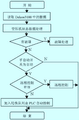 在应答帧中,字节数是指主站要求从站发送的内部寄存器数据的字节数,寄存器1、2…n是指发送的各寄存器的内容,CRC校验与命令帧中的含义相同。 最后需要说明的是,RS-485总线仅用作数据采集,控制信号由PLC的数字量输出模块SM322输出,经过信号线传输到空压机自身的控制继电器,这是由现场的实时性要求决定的。如果控制信号也由CP341模块发出,就需要经过RS-485总线传输到Delcos3100控制器,再由Delcos3100控制器控制空压机的控制继电器;而采用硬接线的方式直接传送控制信号到空压机的控制继电器,就大大缩短了系统的控制响应时间;同时,RS-485总线能够以更快的速度采集实时数据。 3.2 触摸屏通讯 PLC和触摸屏之间的通讯二者均为西门子的产品,通过MPI电缆连接PLC的MPI通信口和触摸屏的RS-485通信口.组态时对相关通讯参数如所要连接CPU的MPI地址和槽号等进行定义,选择接口类型为MPI,将波特率设置为187.5kbps进行简单的组态操作即可实现通讯。 3.3 上位机通讯 在PLC和上位机之间的通讯中,PLC通过以太网模块CP343-1接入工业以太网,上位机通过网络实现远程监控功能。选择接口类型为工业Ethernet,通信速率为100Mbps,设置PLC和上位机的IP地址。 4、软件设计 系统的控制要求如下:手自动转换开关为手动状态的空压机,仅受其Delcos3100控制器控制,以方便机器检修和维护,此时PLC只能采集该Delcos3100控制器中的数据而不能控制空压机;手自动转换开关为自动状态且远程控制无效的空压机,将由PLC进行集中监制,PLC根据风压的变化来决定投入运行的空压机台数,维持风压能够满足井下用风的需要,并且依据空压机运行时间的长短使它们轮换工作;当触摸屏上的远程控制设置无效时,上位机只能监测到空压机的运行状况而没有控制权限,当远程控制有效且手自动转换开关为自动状态时,空压机将只受上位机远程控制。 4.1 PLC监控程序设计 开发环境为SIMATIC STEP7 V5.3 SP2编程软件包,它采用结构化程序设计,程序可读性强,调试和维护方便。单台空压机的主程序流程图如图4所示。