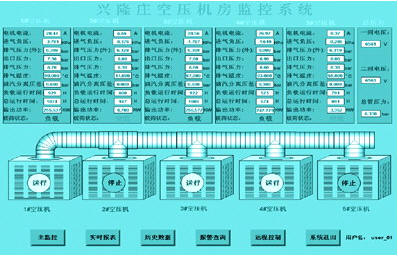 | 力上限值则减少空压机运行的台数,达到既满足井下用风需要、又可以降耗节能的目的。 空压机连续运行8小时后机身温度会很高,需要停机休息,用于散发自身的热量,以保证机器不受损伤。因此,空压机需要进行轮换工作,以保证空压机安全可靠运行,延长设备使用寿命。PLC根据运行时间将受控于PLC的空压机进行排序,建立开机序列和停机序列,当需要增加空压机的运行台数时,PLC将启动总运行时间最短的空压机;当需要减少空压机的运行台数时,PLC将停止本次运行时间最长的空压机。 (2)延时启动和延时停机。PLC自身具有较强的抗干扰能力,但由于现场条件、电网、用风量等各种复杂因素的影响,电机电流、电机电压等受到干扰将产生误报警;如果总管压力的扰动发生在压力下限值或者压力上限值附近,将它们作为一般工状处理就会出现频繁启动、停机现象,影响设备的可靠性和使用寿命。因此,需要对发出动作指令的起因信号作适当的延时处理,以消除扰动,防止误动作。 (3)智能保护。空压机主电机在启动时,启动电流为额定电流的5~7倍,对电网和其他用电设备冲击很大,同时也会影响空压机的使用寿命,所以,空压机不宜频繁启动。为了使系统能够对用风状况进行准确判断,并据此控制空压机的启动,在井下用风高峰期空压机启动较频繁,当两次启动时间间隔小于预先设定的值时,将保持空压机持续运转而不停机,当连续两次加载间隔时间较长时,可认为用风高峰期已过,空压机投入间断运行状态。另外,对电机电流、电机电压、排气压力、进气负压、运行温度、油温、油滤压差等重要参数进行实时监控,出现异常及时进行故障报警,并作出处理。 4.2 触摸屏人机界面设计 选用与触摸屏TP270配套的组态软件Protool/pro设计界面。画面包括:(1)主画面:空压机组的运行状态以及主要参数的显示。(2)数据报表:实时数据汇总显示,并可查询历史数据和总管压力曲线。(3)运行设置:设置启动远程控制是否有效;设置自动启动、停机、加载、卸荷的压力阈值;设置时间参数、报警参数等。(4)报警查询:查询报警详细信息。(5)系统管理。 4.3 上位机监控程序设计 上位机监控软件选用西门子公司基于Windows环境的组态软件WinCC6.0版。主要由监控画面、实时报表、历史数据、报警查询、远程控制和系统管理界面组成,监控画面如图5所示。