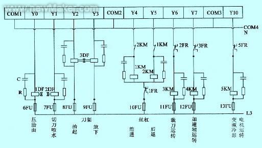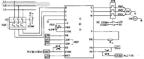 (5 )电磁阀:本控制系统有3 个电磁阀,压胎面电磁阀1 D F 的作用是胎面长度达到预设值且切刀运输带停下后,使压胎面装置下落压住胎面以便切刀切割;切刀喷水电磁阀2 D F 是裁刀在切割胎面过程中对裁刀进行喷水;刀架运动电磁阀3 D F 使刀架抬起和放下。1 D F 、2 D F 选用DF1-1 AC220V;3DF 采用QZ23JD2-L 双控电磁阀,A C 2 2 0 V 。 ( 6 )接触器及热继电器: 该系统中2 Q S~5QS 断路器选用西门子3VU1640、380V 系列;1 K M ~ 5 K M 接触器和继电器分别选择西门子3TF3110、3TF4322、3TF4622,线圈电压为220V系列;该设计中的1 F R ~ 5 F R 共5 个热继电器采用西门子3 U A 5 2 0 0 及3 U A 5 2 4 0 系列。 4 控制电路设计 控制电路主要包括电源回路、电机回路、变频器控制电路、可编程控制器的控制及外部接线。参见图3 、图4 。