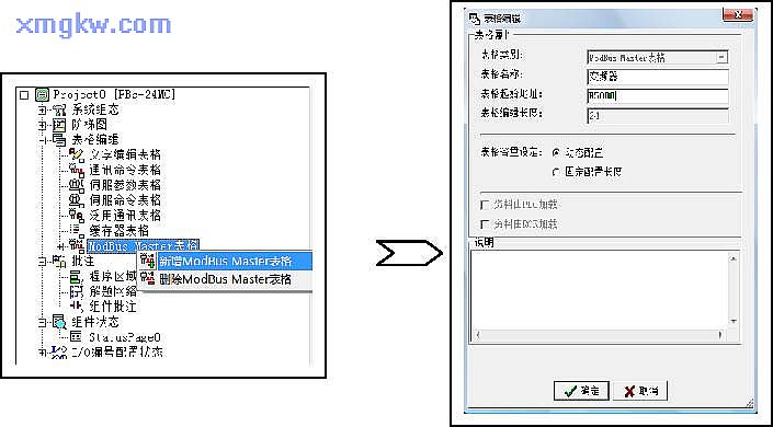 【ModBus Master表格的编辑】方法1:点选菜单栏的“专案” Æ“ModBus Master表格” Æ“新增ModBus Master表格”。方法2:在专案管理窗口,展开“表格编辑”,右键单击“ ModBus Master表格” Æ“增加 ModBus Master表格”,如下图所示。方法3:鼠标左键单击梯形图中的 FUN150指令,按键盘“ Z”,弹出“表格编辑”对话框 。