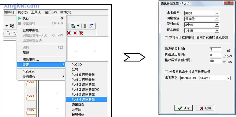 【PLC通讯参数设置】点选菜单栏的“ PLC” Æ“设定”Æ“Port4通讯参数”,通讯协议选用 ModBus RTU(Slave),通讯格式为 9600,E,8,1。如下图所示: