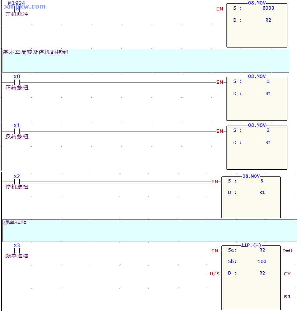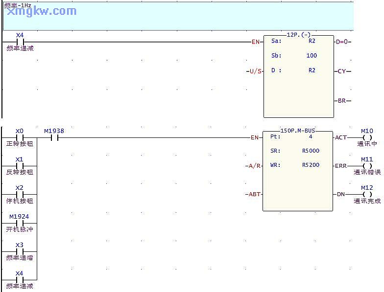 - (3)频率微调变频器 2000H的内容范围是 -10000~10000,表示设定频率为最高频率( P0.04)的-100%~100%,因此可新增一条命令,将 R2单个写入到仆站数据起始地址 408193。本例中,最高频率设为 100Hz,而频率递增按钮 X3每次按下,都会使 R2内容+100,也即增加 1Hz,而频率递减按钮 X4每次按下,都会使得 R2内容减 100,也即减少 1Hz。按此原理,按实际所需,最小可微调 0.01Hz。通讯表格完成后如下图所示。