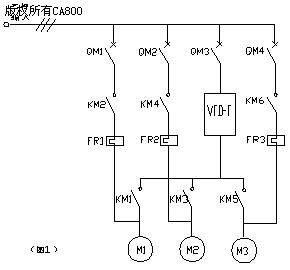 图1 水泵扬程及管阻特性 现有的变频水泵恒压供水方式基于PID控制原理,简单概括就是:维持管路供水压力的恒定。当用户用水量加大时,管路压力减小,变频器转速要提高以增加流量补充压力。反之,用户用水量减小时,管路压力增大,变频器转速要降低,使流量适当降低以使压力恒定。 2.2 多泵供水 多泵供水是最常见的变频供水方案。多泵建筑供水系统普遍采用变频器循环控制方式。多泵控制思路是一拖多工变频结合复合式变流量变频供水。在小流量用水时工况,变频器带一台水泵运行,随用水量的变化,调整水泵的转速,实现恒压供水;当用水量增大,变频器达到50HZ时,变频器发出指令,使该变频泵切换到工频,同时使变频器带动下一台水泵变频软启动运行。随用水流量增大,以后各台水泵的软启动依次类推。当用水量减小时,先停转为工频运行的那台水泵。系统主电路如图1所示。有一点需要说明,由于水泵在工频运行时,变频器不可能对电机进行过载保护,所以必须接入热继电器FR,用于工频运行时的过载保护。