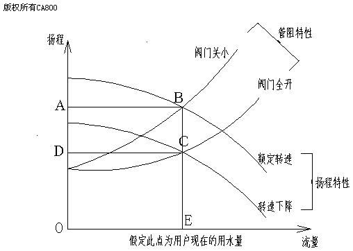 中达电通股份有限公司 北京分公司AMD产品处 刘 一 摘要:台达F系列变频器 PID控制在供水行业里的应用 关键字:PID 差频同相 1 引言 在变频技术应用还未广泛的时期,区域供水系统都是经由市政管网经过二次加压和高位水塔储水池来满足用户对供水压力的要求。日常供水控制通常采用水泵恒速运行加上调整出口阀开度的方式调节供水的水量水压。而由水泵的扬程特性图及管阻特性图可知这种靠调节输出阀门来进行恒压供水的方式使得大量能量消耗在出口阀门而造成浪费,而且存在水池的二次污染问题。 2 恒压供水原理 2.1 供水原理 变频技术通过调速节约了在改变阀门开度上造成的能量浪费,并且由于取消水塔而从原理上解决二次污染问题。阀门控制法的本质是水泵本身的供水能力不变,通过改变水路中的管阻大小来改变流量,以适应用户对流量的需求。而转速特性是在阀门开度不变的情况下,通过调节转速来达到用户要求的水量。我们知道流量与扬程的乘积近似为供水功率,如图1水泵的扬程特性及管阻特性图所示,假定现在用户用水量稳定在E点,我们可以看到在阀门开度不变的情况下单纯调节转速所需要的供水功率(面积OECD)小于转速不变而单纯调节阀门所需的供水功率(面积ABOE),所以说变频技术节约了能量,并且解决了二次污染问题。(如图1所示,面积ABCD即为节约的能量)。
