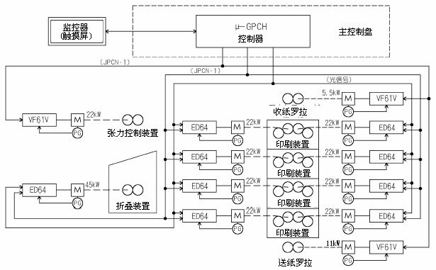 使用同步定位功能的印刷部及纸张折叠部,使用的是「ED 马达」和「ED64SDS」驱动器,使用速度控制功能的送纸部收纸部张力控制部,使用的是「VF64」矢量控制变频器。主控制盘的FA 控制器「μ-GPCH」,以及主控制辅助盘上的「μ-GPCH」是由通信网络「D-RING」连接在一起,控制着整个系统。「μ-GPCH」和「ED64SDS」以及「VF64」变频器使用JEMA 标准网络「JPCN-1」来互相通信、传送讯息。