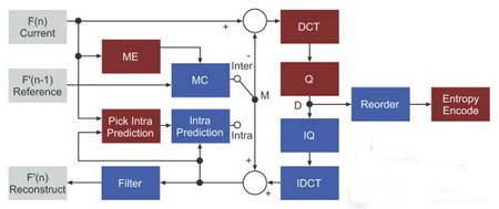 图1显示了H.264编码器的结构图,与其它ME视频编码标准类似,H.264编码器将输入影像分为多个16x16像素的宏块(MB),然后逐块处理。H.264编码器包括正向路径和重构路径。正向路径将帧编码为比特位;重构路径从编码位中产生一个参考帧。下图中的IDCT、IQ、ME和MC分别代表(反向)离散余弦变换、(反向)量化、运动估算及运动补偿。