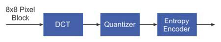 图2给出了JPEG编码器结构图。该编码器将输入影像分为多个8x8像素的模块,然后逐个处理。每个模块首先通过DCT模块,随后量化器根据量化矩阵对DCT系数进行取整。在此过程中,编码质量与压缩比均可根据量化步骤调节。最后熵编码器对量化器输出进行编码,并生成JPEG影像。