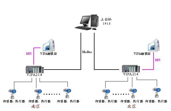| 一、概述 此项目共有38组盘管空调和三通阀门,采用自动控制,要求各组空调出口处温度与设定温度误差范围在1℃以内。所选设备以技术的先进性和产品的可靠性;操作、显示功能完善简便,满足长期运转的条件;系统具备随时扩展升级的可行性。 二、自控结构和原理 1,中央控制室, 中央控制室设置内设工业控制计算机(已有上位IFIX系统),通过现场控制站的PLC的Modbus接口把现场数据传给它。 2,现场控制站分为2个控制站 1#控制站(LCS1) 控制20个阀门,和1个触摸屏嵌入安装。 2#控制站(LCS2) 控制18个阀门,和1个触摸屏嵌入安装。 1#控制站、2#控制站即使与中控室计算机失去通讯,也能保证自己独立正常的运行。 3,通讯方式 1#现场控制站、2#现场控制站均采用VIPA200V系列 PLC.。每个PLC现场站可以独立运行和控制相应的设备。在PLC的上有一个MPI接口,PLC现场站通过MPI接口经过MPI电缆和设在控制站的VIPA触摸屏通讯。 VIPA触摸屏负责显示本地控制站的实时数据的显示和控制。中控室上位工控机应带有工业485接口,中控室上位工控机带的485接口通过Modbus总线与每个PLC现场站通讯,保持上位监控画面与设备实时状态的同步。 4、系统结构图 ![]() 三、控制方式 通过传感器检测的温度和设定温度自动调节相应的阀门,采用PID方式。PID程序在PLC中运行,采用西门子的STEP7编程软件编程。当现场温度高于设定温度时,PID的输出加大冷却水流量阀门开度,反之当现场温度低于设定温度时就减小冷却水阀门开度。这样使现场温度最终能稳定在设定值附件。 各阀门都有1个PLC-AO控制阀门角行程执行器,并通过1个PLC-AI实时监视阀门的角行程执行器的执行状态。 每个空调出口有一个温度传感器,把温度信号接入PLC。 VIPA触摸屏实时反映阀门和温度的实时状态,并且可以上位手动控制,VIPA触摸屏可选择是由上位监控软件主控还是由VIPA触摸屏本地主控。VIPA触摸屏操作系统为WINCE,组态软件为MOVICON。 四、结束语 整个系统从设计、调试、交付用户只用了短短三个月时间,现在为止已正常运行,用户反映良好。 【附】VIPA PLC简介 德国VIPA 是自动化元器件及系统的专业制造商,国际 Profibus组织成员。200V系统为中小型控制系统,相当于SIEMENS S7-300,是基于现场总线的主/从站模块化控制系统,单个摸块的尺寸仅为76 X 25.4 X76mm,直接安装在标准35mm导轨上,模块间的电器联结通过嵌入导轨的背板实现。各种模块的灵活组合,可准确构成用户所需的系统。每排可连接多至32个模块,也可通过基本接口模块和扩展接口模块组合成并排安装。CPU的MP2I接口不仅支持MPI通讯,也可不使用MPI适配器,用VIPA绿电缆(RS-232 COM)实现PC和CPU之间的点到点通讯。 200V系统具有多种形式的CPU,内部集成2M FlashROM,外部存储MMC卡可达64M,I/O地址容量为1024 bit.可分别采用Win PLC7或SIEMENS 的Step 5,Step7编程。CPU可集成Profibus主站或从站,CANopen主站,以太网TCP/IP接口。通过Profibus,Interbus,CANopen, DeviceNet和Ethernet等接口模块构成主、从站系统。 |