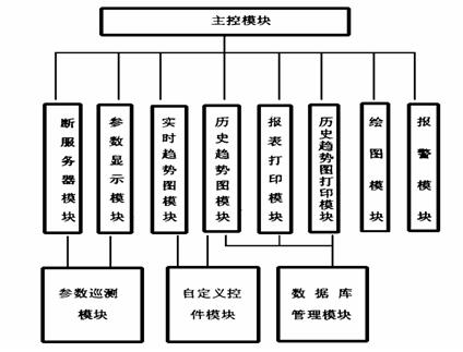 软件系统分为主程序和中断服务程序,主程序完成系统的初始化和人机界面的管理。包括显示器管理,键盘管理,命令处理模块,时钟管理,改字处理模块等。中断服务程序完成与下位机的通信,工程量变换,自动报警处理,历史数据存储。