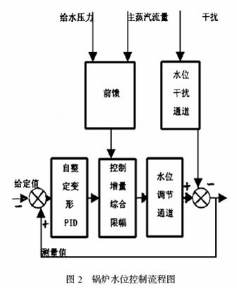 给水调节系统的任务是与锅炉蒸发量相平衡,并维持汽包水位在工艺规定的范围,给水系统采用三冲量自动调节。水位控制流程如图2 所示。