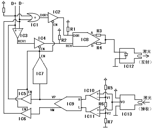 图1为将USB信号(D+、D—)转换为光纤传输信号——激光的框图。USB信号检测电路(1)将D+和D—变换为“或”门输出DOR1和差分比较器输出RCV1。一双可控三态缓冲器(2)通过控制端EN来控制逻辑“通”与“端”。当EN=“0”时,DOR=DOR1、RCV=RCV1。而当EN=“1”时,DOR和RCV为高阻状态。激光发射驱动电路(3)将DOR和RCV转换为三种激光强度(亮、半亮、暗)。激光接收电路(4)将接收到的三种激光强度(亮、半亮、暗)恢复为D+和D—的三种状态。激光接收电路(4)的输出之一H的状态变化触发单稳延时电路(5)。单稳延时电路(5)的输出EN平时(即USB信号处于闲置状态时)为“0”,当其输入H有下降延(即由“1”变为“0”)时输出EN由“0”变为“1”并且保持为“1”大约1000us,然后恢复为“0”。另一双可控三态缓冲器(2)通过控制端EN来控制来控制逻辑“通”与“断”,当EN=“1”时,VP=H、VM=L,而当EN=“0”时输出VP、VM为高阻状态。 2.2 将USB信号转换为便于光纤传输的电路图