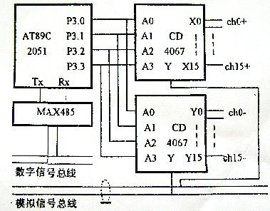 2 系统硬件设计 主机PC所配的RS-232/RS-485转换器和微型数据采集器都已有市售的产品,价格也较低。RS-485数字信号总线经过MAX485芯片转换成TTL电平的RS-232信号以便与AT89C2051的串行口相配。AT89C2051的P1.0~P1.3分别接到两片CD4067(16选1多路开关)的地址选择端A0~A3。这样当P1.0~P1.3输出某个通道号(比如A3A2A1A0=0001)时,CH1的正端CH1+(即X1端)和CH—(即Y1端)同时选通。选用双端信号方式而不用单端信号方式(此时所有通道负端全部共地)的好处在于各个通道可以相互独立的输出信号或接收控制信号,因而各通道所接的传感器可以公用一个电源。两片CD4067的公共端X和Y分别接到模拟信号总线的正端和负端,整个从机电路用单5V电源供电,功耗大约100mW。