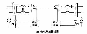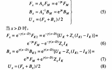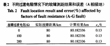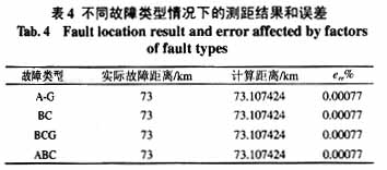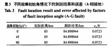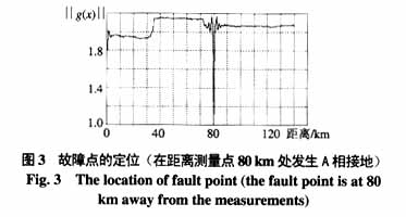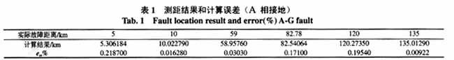 假设采样周期为Ts ,s,线路的相模传播参数为γ1=α1+jω/v1,v1为相模分量的传播速度,相模波阻抗为ZC1,地模的传播参数γ0=α0+jω/v0,v0为地模分量的传播速度,地模波阻抗为ZC0。将线路分成N段,每小段的长度△x=Ts×v1,首先将M端测量到的三相电压电流转换成3个独立的模量电压和电流,M点的3个模量的前行波 由于零模分量的传播速度与相模分量不同,在k时刻的零模分量需要用到M点k±nv1/v0时刻的值,由于v1/v0不是整数,因此xn点的零模分量可以用插值法计算得到为 再利用模量变换矩阵将所得到的模量电压值反变换到相域。就可以用单端量求得电压沿线路的分布。当然,这个分布在故障点以后是“虚假”的。然后求取沿电压线路分布函数对距离的导数: 式中 N为时间窗的宽度。 该有效值的最小值点即对应线路的故障点。假设对应的最小值点为J,那么故障距离则为 D=J·△x 4 EMTP 仿真 文献[7>提供的某双端电源400 kV输电线路,其长度为140 km,如图2(a)所示,杆塔结构及相关参数如图2(b)所示。测距装置在M侧母线,其测量电压和电流的采样频率为500 kHz,用EMTP LINE CONSTANT子程序计算得到的相模和地模中的行波传播速度分别为v1=294788km/s和v0=252210 km/s。以相模分量为基准对线路分段,△x=294778.2´10-6=0.59 km。当线路在距离测量点80 km处发生A相接地故障时(过渡电阻为100Ω),A相电压沿线对距离导数的沿线分布如图3所示,其最小值点即为故障点。计算的故障距离D=80.182km。 表1给出了分别在距离M侧不同故障位置发生单相接地短路(A相接地)时的测距结果和误差。表2~4分别给出了不同的过渡电阻、不同的故障时刻、以及不同的故障类型下的测距结果和误差。其中,误差err/%定义为 表2~4分别给出不同过渡电阻、不同故障初始角以及不同故障类型情况下的测距结果。初步的仿真结果表明,该测距算法基本上不受故障过渡电阻、故障初始角以及故障类型的影响,有较高的精确度,且其测距的死区范围很短。测距的死区与分段线路的长度即采样频率有关,本算例的死区为距离测量点0.59 km。 5 结论 在研究了输电线路电报方程解的基础上,发现利用单端电压电流量虽然不能得到全线路的电压分布,但其对距离的导数在整个线路上的分布是基本真实的,并发现,电压对距离导数沿线路的分布函数在故障点呈现最小值。基于上述结论,本文提出了一种新的单端故障测距原理,利用单端电压电流计算“虚假”的电压沿线路分布,然后求取其对距离的导数,其对距离导数的范数值在故障点呈现最小值。EMTP仿真结果表明,本测距算法具有较高的精确度,且基本不受故障类型、过渡电阻、故障初始角的影响。故障测距死区与采样频率有关,采样频率越高,死区越短。本算法的缺点是要求的采样频率比较高,否则将影响测距的精确度,另外,当测量点的电压经过PT和CT发生畸变时,该算法的精度需要进一步的研究和探讨。 |