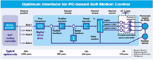 采用模拟驱动器连接界面,可实现PC-based软运动控制,但这样未能充分体现如今的低成本、高性能的数字技术。更好的方法是实现软运动控制,如下图所示: