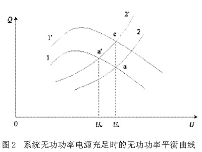 1.2 系统无功功率电源充足时的无功功率平衡 在正常情况下(系统电压为额定电压),如图2所示。系统无功电源Q同电压U的关系为曲线1,负荷的无功电压特性为曲线2,两者的交点a确定了负荷节点的电压Ua。