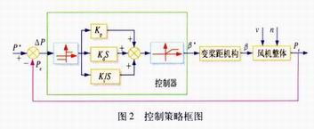 控制器设计 本控制器的基本目的是通过调节桨距角来调节功率恒定输出。如图2所示,通过电量采集测出当前发电机输出功率P。与给定功率P*相比,计算出功率误差△P。功率的偏差作为PID控制器的输入量,控制器根据厶户发出叶片参考桨距角的β*的命令,然后计算出当前桨距角误差△β=β*-β(当前桨距角β),而后根据变距机构的参数确定桨距变化速率。参考桨距角限制在0~92°范围内,控制器在这一范围内,按照新的桨距角要求调节风力机桨叶。 图2方框内是PID控制器,比例、积分、微分增益Kp、Ki、Kd的稳定数值范围由图所示的闭环传递函数的劳斯稳定判据确定。比例、积分、微分的增益通过模拟得到具体值,其原则是使风机功率输出维持在额定输出功率。