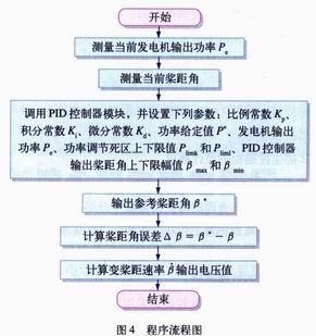 仿真结果 1)桨距角变化速率在液压系统允许的-5°/s~+5°/s的范围内变化。 2)桨距角β的变化与风速v的变化趋势一样,风速v增加,平均桨距角β增大;相反,风速v降低,平均桨距角β减小。 3)风机叶片瞬时吸收的功率Pmech和风能利用系数Cp变化趋势显示,桨距角β的变化限制了叶片瞬时吸收的功率Pmech,叶片工作在较低的效率上。 4)发电机输出功率Pe能够通过桨距角β的变化作用在额定功率附近平滑变化,保持恒功率。 5)发电机转速的波动被(Pmech-Pe)和机组的惯性影响。 基于风力发电机组电控系统工作在恶劣的自然环境和强电磁干扰中,对控制系统的可靠性和抗干扰性要求很高,为此我们选用了西门子S7-300(CPU选用的是315—2DP)系列可编程序控制器作为整个电控系统的控制核心。S7-300控制器内部自带有连续PID控制器功能“CONT_C”,实际使用中我们只需要调用“CONT_C”,并为其设定相关参数即可。“CONT_C”的部分使用程序如下: I_ITL_ON:= D_SEL:= CYCLE:= SP_INT:="DB9".an_power_set ∥功率给定值 PV_IN:="DB6".an_power ∥发电机输出功率 PV_PER:= MAN := GAIN :="DB9".GAINl ∥比例常数 TI :="DB9".TI1 ∥积分常数 TD :="DB9".TD1 ∥微分常数 TM_LAG:= DEADB_W:="DB9".an_deadband1 ∥功率调节死区 LMN_HLM:="DB9". ∥输出桨距角上限值 LMN_LLM:="DB9". ∥输出桨距角下限值 PV_FAC:= PV_OFF:= LMN_FAC:= LMN_OFF:= I_TLVAL:= DISV := LMN :="DB9".out_pitch ∥输出参考桨距角 LMN_PER:= QLMN_HLM:= 系统程序的流程图如下: