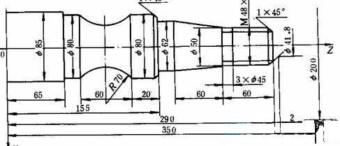 | 在CK7815型数控车床上对图1所示的零件进行精加工。图中φ85mm不加工,要求编制精加工程序。 (一)首先根据图纸要求按先主后次的加工原则,确定工艺路线 1)先从左至右切削外轮廓面。其路线为;倒角—切削螺纹的实际外圆—切削锥度部分—车削φ62mm外圆—倒角—车φ80mm外圆—切削圆弧部分—车φ80mm外圆。 2)切3mm xφ45mm的槽。 3)车M48x1.5的螺纹。 ![]() 图1 (二)选择刀具并绘制刀具布置图 根据加工要求需选用三把刀具。l号刀车外圆,2号刀切槽,3号刀车螺纹。在绘制刀具布置图时,要正确选择换刀点,以避免换刀时刀具与机床、工件及夹具发生碰撞现象。本例换刀点选为A(200,350)点。 (三)确定切削用量(如表4-6所示) ![]() (四)编制精加工程序 该机床可以采用绝对值和增量值混合编程,绝对值用X、Z地址,增量值用U、W地址,采用小数点编程。 N0l G50 X200.2350.;(坐标系设定) N02 S630 M03 T0101 M08; N03 GOO X41.8 Z292.; N04 G01 X47.8 Z289. FO.15;(倒角) N05 U0 W-59.O;(φ47.8mm) N06 X50.OW0;(退刀) N07 X62. W-60.;(锥度) N08 UO Zl55.;( 62mm) N09 X78. W0;(退刀) N10 X80. W-1.0;(倒角) Nll UO W-9.0;(车φ80mm外圆) N12 G02 UO W-60. I63.25 K-30.;(圆弧) N13 G01 UO Z65.;(车φ80mm外圆) N14 X90. W0; N15 GOO X200. Z350.M05 T0100 M09(退刀) N16 X51.Z230.S315 M03 T0202 M08; N17 G01 X45.WO FO.16;(切槽) N18 G04 X5.;(延时) N19 GOO X51.;(退刀) N20 X200. Z350. M05 T0200 M09;(退刀) N21 G00 X52. Z296.S200 M03 T0303 M08; N22 G92 X47.2 Z231.5 F1.5;(切螺纹) N23 X46.6: N24 X46.2, N25 X45.8; N26 G00 X200. Z350.T0300;(退至起点) N27 M30; |