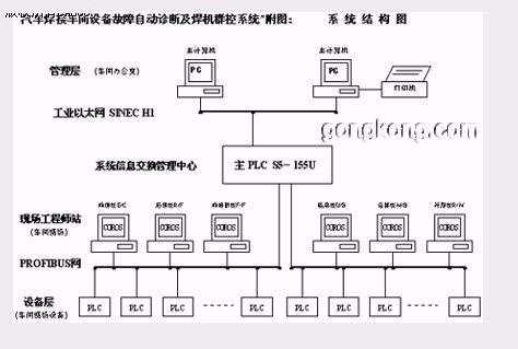 我们针对上海大众汽车二厂焊接车间,利用西门子公司的 SIMATIC产品,设计并实施完成一套设备故障自动诊断及焊机群控系统。经过几年的使用,该系统运行稳定可靠,基本达到了设计目的。 一. 焊接车间现状分析 该焊接车间主要生产桑塔纳2000型轿车的车身。车间进料为冲压车间的各种冲压零件,经过焊接生产流水线,先把这些各种零件焊接拼装各种车身部件,如汽车前围、后围、前底板等部件,再经过总拼把这些部件拼焊成整体车身,最后经过补焊、打磨形成最终的白车身,输出到油漆车间喷漆。该焊接车间按照冲压零件-部件-总拼的焊接加工过程,建立了六条生产流水线,分别为前围线、后围线、前底板线、底板线、总拼线和补焊线。这六条生产流水线按照生产工艺相互刚性连接。在这些生产流水线上的各个工位主要配备的是焊接机械手、焊接机械人、多点焊机、拉杆传输和空中输送车等自动化设备组成。由44台西门子公司的PLC分别控制这些生产流水线上的各种加工设备,使其相互协调地、连续地、自动地运行,使车间达到每56秒钟生产一部白车身的的生产节拍的能力。 但是该车间生产流水线投入运行时,存在两个主要的问题: 当设备上某处出现故障时,由于不能很快地排除,经常造成整条生产线停机,或者整个车间停产,严重影响车间产量和生产节拍。 会发生某些焊点的焊接质量不稳定,不能保证白车身质量。 经过调查研究和具体分析,发生上述问题的主要原因是: 生产线上设备比较多,设备比较复杂,生产线之间又是刚性连接,如果某一部位发生机械、液压或电气故障会造成某条生产线停机,维修人员要经过一定时间的分析查找过程,才能找到故障点,才能排除故障。在故障的分析查找和排除的时间内,由于生产线之间无缓冲,前面的生产线立即停机,后面生产线造成空工位,这个时间过长,还会造成后面生产线停机。而故障的分析查找和排除的时间中占主要的是分析查找时间。 该车间共有两千多把电焊枪在同时工作,容易造成供电压波动。如果一部分电焊枪正赶在电压低谷通电焊接,容易发生该焊点焊接不实,质量不好。 所以,为了快速分析查找故障和保证正常电压通电焊接,解=决上述两个问题,我们为车间建立这套设备故障自动诊断及焊机群控系统。 二. 系统的硬件和软件结构 设备层 全车间六条生产线上共有PLC 44 台,由 S5-115U、S5-135U和S5-55U构成。这些PLC可向系统提供分析设备运行状态和分析出发生的故障点的相关信息。但这些PLC是分散的,无故障诊断能力。所以,我们的系统在车间建立了两段现场工业总线Profibus 网,分别把这些PLC连接起来。使系统能够通过现场PLC采集和汇总生产线上设备状态信息,自动分析诊断故障。设备并网的具体做法是,每台PLC 上都插入Profibus网卡CP5431,并连接在其中一段现场工业总线上。(参见附图) 现场工程师站 现场工程师站设置在车间现场,是由六台工控机组成,分别对应着车间现场六条生产线。这六台工控机上都分别插有 Profibus 网卡CP5412,并通过该卡连接在 Profibus 的网上。通过现场工程师站可以监控对应的生产流水线。(参见附图) 信息交换中心 信息交换中心是由一台 S5-155U 构成,也称为系统的主PLC。一方面通过车间现场工业总线 Profibus 网,连接生产线上 44台 PLC,采集汇总分析生产线上设备的故障信息;另一方面通过工业以太网 H1 与系统的管理层连接,把分析诊断结果送到办公室计算机上,同时又通过车间现场工业总线 Profibus 网把其分析诊断结果送回现场工程师站。(参见附图)