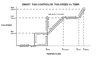 根据图2,散热器的热阻RTf应为: RTf=(RTj-Ta)/Pc-RTj-RTc 散热器热阻RTf是选择散热器的主要依据。Tj、RTj是半导体器件提供的参,Pc是设计要求的参数,RTc可以从热设计专业书籍中查到。下面介绍一下散热器的选择。 (1)自然冷却散热器的选择 首先按以下式子计算总热阻RT和散热器的热阻RTf,即: RT=(Tjmax-Ta)/Pc RTf=RT-RTj-RT。 算出RT和RTf之后,可根据RTf和Pc来选择散热器。选择时,根据所选散热RTf和Pc曲线,在横坐标上查出已知Pc,再查出与Pc对应的散热器的热阻R''Tf。 按照R''Tf≤RTf的原则选择合理的散热器即可。 (2)强迫风冷散热器的选择 强迫风冷散热器在选择时应根据散热器的热阻RTf和风速来选择合适的散热器。 (3)散热风扇的设计 普通商用交换机的风扇,工作一直处于全速(Full SPD)状态,除其造成电能浪费、增大整机噪音外,还会增加不必要的电源发热,机箱内灰尘过多堆积等。更重要的是风扇在全速状态时其寿命约为2万小时,也就是2.28年(由SANYO FAN DATA SHEET 给出的数据),2万小时后风扇转速会逐渐下降,给整机带来不稳定因素。但由于没有监控单元,这种隐患很难发现:例如当交换机丢包率逐渐上升时,并不容易查到是由于风扇老化转速降低及灰尘堆积太厚导致机箱内关键部件温度升高所致。 因此工业交换机应使用高速(High SPD)风扇并带有智能监控电路,实时监测和控制网络交换机的运行状况,例如监控机箱风扇、主交换芯片温度、机箱温度,光收发器件温度等,这也就是我们所说的“智能风扇”。 交换机工作过程中智能监控电路会根据被测元件的温度或风扇转速信号自动调节风扇转速,给网络交换机散热。风扇的转速主要与交换机负载和环境温度有关。在环境温度一定时,当交换机数据负载减轻时,功耗减小,风扇转速自动降低,当交换机数据负载加重时,功耗加大,风扇速转速自动上升。在数据负载一定的情况下,当交换机处在低温环境时,风扇转速自动降低,处在高温环境时风扇转速自动升高。在高温高负载情况下,风扇可处在应急高速(High SPD)状态,比全速(Full SPD)状态更能保证网络安全运行。如下图:
