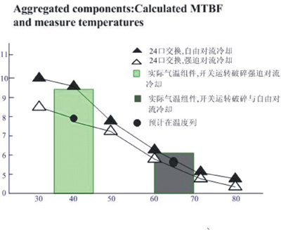 衡量可靠性的指标很多,常见的有以下几种: (1)可靠度R(t),即产生在规定条件下、规定时间内完成规定功能的概率,亦称平均无故障时间MTBF(mean time between failure); (2)均维修时间MTTR是指产品从发现故障到恢复规定功能所需要的时间; (3)失效率λ(t)是指产品在规定的使用条件下使用到时刻t后,产品失效的概率;产品的可靠性变化一般都有一定的规律,其特征曲线如图1所示,由于其形状象浴盆,通常称之为“浴盆曲线”。在实验和设计初期,由于产品设计制造中的错误、软件不完善以及元器件筛选不够等原因而造成早期失效率高;通过修正设计、改进工艺、老化元器件、以及整机试验等,使产品进入稳定的偶然失效期;使用一般时间后,由于器件耗损、整机老化以及维护等原因,产品进入了耗损失效期。这就是可靠性特征曲线逞“浴盆曲线”型的原因。 而衡量一个电子产品、尤其是工业类产品最常用的是采用MTBF,也就是平均无故障时间。 二、温度和MTBF的关系由于现代电子设备所用的电子元器件的密度越来越高,这将使元器件之间通过传导、辐射和对流产生热耦合。因此,热应力已经成为影响电子元器件失效率的一个最重要的因素。对于某些电路来说,可靠性几乎完全取决于热环境。所以,为了达到预期的可靠性目的,必须将元器件的温度降低到实际可以达到的最低水平。有资料表明:环境温度每提高10℃,元器件寿命约降低1/2。这就是有名的“10℃法则”。 MTBF 测试 目前国外广泛采用Bellcore 的RPP(Reliability Prediction Procedure)来测量设备的MTBF,这其中包括晶体管数量、功额衰减以及环境参数。我们分析其中有用风扇散热的24口网络交换机的检测报告,如下图3: