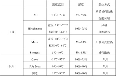 工业以太网交换机和普通交换机的区别主要体现在功能和性能上。功能上的区别主要是指工业以太网交换机在功能上与工业网络通讯更接近,比如与各种现场总线的互通互联、设备的冗余以及设备的实时等;而性能上的区别则主要体现在适应外界环境参数的不同。工业环境除了有很多如煤矿、舰船等特别恶劣的环境外还有在EMI(电磁兼容性)、温度、湿度以及防尘等方面有特殊要求的环境。这其中温度对工业网络设备的影响面是最广泛的。本文主要论述温度这一重要参数对工业网络交换机的影响。而对于功能方面以及性能其他方面的参数这里不在赘述。表一列举了目前主要品牌的工业及商用网络交换机的温度参数。