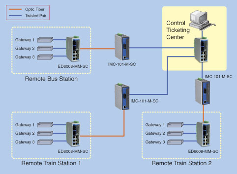 | 系统描述 建立相应的合作伙伴关系,关键在于实施中央处理系统并设立相应规则以确保各个处理系统与中央处理系统之间的协同工作能力。系统当中使用的设备是由不同国家和地区的供应商提供的。因为客户采用了Moxa的以太网解决方案,所以各个公交公司无需采用额外的设备便可以实现系统之间的互连。换句话说,该系统可以让各个公交公司存储它们自己的数据、维护自己的客户关系、制定自己的价格、路线和区域。Moxa的工业以太网产品组成的系统解决方案可以满足这些需求。 系统中一共包含46个远程火车/汽车站,共采用了Moxa192台ED6008-MM-SC高效能以太网交换机。该交换机支持冗余环网,自动e-mail报警和Web浏览器管理功能,具备处理大量乘客信息的能力。为了延伸网络传输距离,该项目的系统集成商采用了Moxa的IMC-101-M-SC光电转换器。该转换器具备工业级的设计,MTBF高达810000小时,可以在恶劣的铁路环境当中表现出可靠、稳定的性能。Moxa工业级的网络产品可以确保电子票务系统的稳定性。 MOXA解决方案 1. 当侦测到网络断线时,采用内建的e-mail和继电器输出报警,并以实时的信息通知系统管理员。 2. 易于使用的web浏览器,Windows Utility和Telnet/串口Console配置方式,保证快速准确安装。 3. 易于同其他系统和应用实现集成 4. Moxa的产品为工业等级设计,适用于任何苛刻的环境。 5. Moxa提供了快速的技术支持和5年质保。 主要产品 ED6008-MM-SC • 快速冗余环网能力(自愈时间<300 ms) • 用户自定义e-mail或继电器报警 • 采用web浏览器,Windows Utility或Telnet/串口Console可以轻松管理设备 • 提供-40~75˚C宽温型号产品 • ED6008-MM-SC已升级至EDS-408AMM-SC IMC-101-M-SC • 支持Link Fault Pass-Through(LFP) • 意外事件继电器输出报警 • 24 VDC冗余电源输入 • 提供-40~75˚C宽温型号产品 |