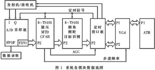 | 现今的信号处理设备越来越复杂,不仅要求高速的处理能力,而且要求功能多样化,仅仅追求速度已经不能满足需求。尤其在复杂多变的环境中,要求信号处理机能够完成多种处理功能,并能方便灵活地切换工作模式。因此有必要发展一种可重构和可扩展的通用信号处理系统,能将信号处理机多功能化、模块化、标准化和通用化。将嵌入式操作系统与高速实时信号处理机结合,可以很好地实现这些要求。在雷达火控系统中,信号处理不仅需要很高的处理速度,而且要满足控制显示多方面的需求,如果没有操作系统,实现起来不仅复杂而且不便于系统的模块化和标准化。因此,采用实时操作系统VxWorks实现雷达系统的控制和显示功能。VxWorks是一种类UNIX的高性能嵌入式实时操作系统,其中断响应速度是微秒级的。它是专门为实时嵌入式系统开发的操作系统,提供了高效的实时任务调度、中断管理、实时系统资源及实时任务通信。VxWorks可以为各种CPU硬件平台提供统一的接口和一致的运行特征,这便于以后的系统移植和升级。基于以上优点,VxWorks广泛应用于航空、航天、医疗、通信、雷达和声纳等领域。 1 系统硬件设计与实现 本系统硬件基于6U的VME总线设计,由多个子模块组成,包括A/D采样板、信号处理板、定时接口板、嵌入式计算机VG4。 A/D采样板作为前端采集雷达的回波信号。它采用AD10242,采样率为32MHz,包含2个A/D变换器,可以对两路模拟信号作模数变换,输出2个12位的数据。由于采样的数据率远低于DSP的处理能力,所以通过大容量的FIFO对A/D采样的数据缓存,再以DMA的方式发送给DSP处理。为了满足要求,信号处理系统以流水的方式处理数据。通过链路口和总线使多片DSP进行数据传输,最后,由VG4显示目标检测结果。 VG4是SBS公司的一款专门针对工业控制设计的嵌入式计算机。VG4的处理器采用Motorola PowerPC 755,主频400MHz,拥有64MB SDRAM,16MB Flash用来固化操作系统和应用程序,而且提供了丰富的接口。VxWorks操作系统及其应用程序在VG4上运行。由于目标机VG4的资源有限,程序的开发由主机的交叉开发平台Tornado完成,通过串口和以太网下载目标代码并调试。程序开发完成后可以固化在目标机VG4的Flash上,这样系统每次启动就从Flash加载程序。操作系统应用程序的开发主要采用C语言。系统的数据流如图1所示。 ![]() 1.1 定时接口板的设计 定时接口板对于整个系统实时稳定的工作起了关键作用。它产生的定时脉冲信号控制着发射接收机、A/D采样板、信号处理板和VG4。 定时接口板通过VME总线与VG4进行数据传输。VME总线是一种高性能的背板总线,由于采用高电流总线信号、严密的逻辑仲裁,所以具有极强的总线驱动能力及较长的信号线传输路径,可支持21个VME板卡的直接相连,信号可靠性非常高。VME总线由于其信号的高稳定性、并行性和高可靠性,被广泛应用于多DSP系统中。 接口板上的FPGA实现VME桥接功能,使双口RAM连到VME总线和TS101的总线上,以进行数据传输。通过软件操作VG4控制定时接口板启动波驻起始脉冲串T0,在每个波驻起始脉冲产生的同时产生定时中断脉冲,作为每帧定时信号组的时间基准。中断信号通过VME总线中断VG4,并作为其中断请求信号。VG4响应定时中断脉冲,向定时接口板传送控制参数。定时接口板据此参数控制信处、AD、收发设备,并接收信处回传的检测结果,传给VG4进行处理和显示。数据是由外部中断驱动的,所以能满足实时性要求。定时接口板结构如图2所示。 ![]() 1.2 信号处理板的设计 雷达信号处理的实时性和连续性要求处理系统应具有较高的数据处理能力。本系统设计时采用多片DSP构成并行处理系统,以提高系统的数据处理能力。信号处理系统核心单元是美国Analog Devices Inc公司生产的ADSP-TS101,其峰值运算能力可达18亿次/秒。它采用了改进的静态超标量流水结构,可以构成各种不同的并行多处理器系统,较好地满足了雷达信号处理的要求。 为了保证系统的数据吞吐能力,采用数据入口与出口分开的方法,系统中各DSP分别接收处理位于不同时间段的雷达回波信号。为了使各DSP协调工作,DSP间的通信必不可少。本系统采用共享总线的分布式结构,使得各DSP之间的通信有多种途径。为了信号处理板的通用性和灵活性,设计由四片DSP组成的共享总线结构子板,各DSP间用链路口点对点环形相连,将各信号线通过PMC插槽引出,与母板通信。信号处理板结构如图3所示。 2 嵌入式实时操作系统VxWorks VxWorks是实时多任务操作系统,它能在确定的时间内执行其功能,并对外部异步事件作出响应。多任务环境允许一个实时应用划分为多个独立任务运行,各任务有各自的线程和系统资源。VxWorks实时操作系统由多个相对独立的目标模块组成,用户可根据需要选择适当模块来裁剪及配置系统,从而有效地保证系统的安全性和可靠性。这样,通过目标模块之间的按需组合,可得到许多满足功能需求的应用。 ![]() 下面介绍VxWorks的技术特征。 (1)任务 在VxWorks中,最小的程序运行单位称为任务(Task)。建立任务时,要对其分配一段固定的代码和数据空间。操作系统内核通过任务控制块对它的执行、通信、资源等情况进行控制。任务具有就绪、阻塞、挂起和延迟等状态。与大多数嵌入式系统一样,在VxWorks中,所有任务存在于统一的线性空间中共享物理内存,每个任务没有自己独立的代码段和堆,