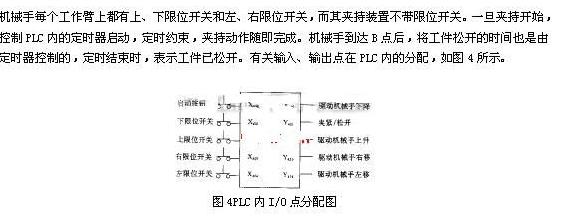 该机械手的动作过程如下:当按下启动按钮时,机械手从原点开始下降,下降到底时,碰到下限位开关(X401接通),下降停止。同时接通定时器,机械手开始夹紧工件,定时结束,夹持完成。机械手上升,上升到顶时,碰到上限位开关(X402接通),上升停止。机械手右移,右移碰到右限位开关(X403接通)时,右移停止。机械手下降,下降到底,碰到下限位开关(X401接通)时,下降停止。同时接通定时器,机械手放松工件,定时结束,工件已松开。机械手上升,上升到顶碰到上限位开关(X402接通)时,上升停止。机械手左移,左移到原点碰到左限位开关(X404接通)时,左移停止。于是机械手动作的一个周期结束。