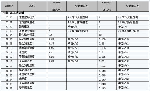 参数学习好后,通过增加的参数组(见五),由操作台控制大小车切换动作,变频器自动切换两组参数拖动两组电机分别闭环运行。 五、参数简表: