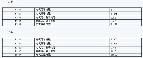 a)参数辨识过程与提升电机参数辨识过程一样,现在通过手动控制,使变频器分别拖动大小车两组电机,大车电机将6个电机作为一个整体控制对象来看,这时设定的电机参数中电流与功率为6个电机之和。同理小车亦采用同样方法处理,如下表: 大小车设定的参数: 大车:
