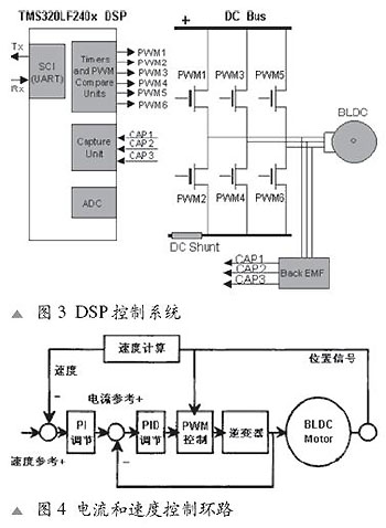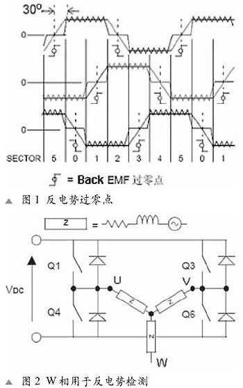 应用实例:单片机/电机控制实例 单片机设计中带有内建的外设,因此只需要最少量的外部元器件就可以容易地实现BDC电机的速度和方向控制。PIC16F684是一款14引脚单片机,对于低成本双向BDC电机控制非常理想。之所以选择PIC16F684 做为例子,是因为这款单片机带有内建的外设,只需要最少量的外部元器件就可以容易地实现BDC电机的速度和方向控制。这款单片机的两大特点对于BDC电机控制非常有用。首先,片上内建有增强捕获/比较/PWM(ECCP)模块,当配置为全桥模式时,可以提供直接驱动H桥电路所需要的PWM信号。H桥电路可以为电机提供双向电流驱动。PIC16F684第二个非常适合电机控制器的特点是可以产生频率高达31.2 kHz的8位PWM信号。对于电机控制应用来说,这一点很重要,因为低于20 kHz的频率会导致电机产生人听觉范围内的噪声。不需要增加任何外部时钟源,PIC16F684 就可以提供高于听觉频率的8位分辨率。为了获得高出听觉频率范围的频率,此前的单片机需要在运行时降低PWM的分辨率。与其它具备ECCP的单片机相比,PIC16F684体积小且成本效率高。利用片上ECCP模块做为PWM硬件发生器,而不是采用过去的软件解决方案,宝贵的单片机处理器资源可以用于完成其它任务。 此类应用中使用的片上外设除ECCP模块外,还有一个内部10位模数转换器(ADC)。ECCP有捕获模式(可捕获定时器寄存器的16位值)、几个比较器和4个PWM。在无传感器的BDC电机控制应用中,4个PWM通道是一个重要优势。如图2所示,配合外部桥和4个FET驱动器件,单片机的PWM模块可以容易地实现双向电机控制。 图2中的低成本BDC电机控制系统在全桥PWM模式下使用ECCP。用户可容易地配置PWM占空比,并实时改变单片机内部振荡器。此外,利用单片机片上的一个10位ADC来测量反向电动势(EMF),PIC16F684可以容易地跟踪电机的转速(RPM)。
