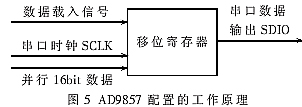 在设计PCB电路板时一定要注意AD9857的数字地和模拟地的划分,这样输出信号的信噪比才会比较好,并且要用专门的地来包裹时钟信号线使其免受干扰。 4.2 AD9857的配置 通过FPGA对AD9857的配置线的控制,可以很方便地实现对AD9857的配置。AD9857的配置原理如图5所示,把要写入AD9857内部寄存器的数据通过数据载入信号载入移位寄存器,然后再把这16bit数据串行输出到AD9857的SDIO管脚,实现对AD9857的配置。