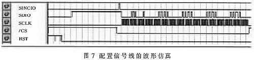 由于本方案只用了AD9857内部的8个寄存器,因此状态机只有8个状态,如果需要用到更多的AD9857的内部寄存器,只需要增加状态机的状态即可。 4.3 波形仿真 图7为用QUARTUS II软件对AD9857配置线的波形仿真,从图中可以很清楚地看到AD9857的各个配置线的工作情况。在配置AD9857之前,由RST信号将内部寄存器复位;SYNCIO信号标志配置的开始; /CS,SCLK,SDIO的控制时序与图3的串口操作时序相同,这样AD9857就可以工作在用户需要的工作模式下了。