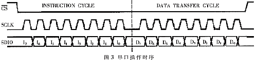 目前常用的数字上变频芯片是AD9856和AD9857,这两个芯片都是由AD公司生产的通用、高性能的数字上变频器件,具有集成度高、性能好、功耗低等特点,使用这两个芯片可以很容易实现信号的数字正交调制。AD9857与AD9856相比,还有如下的不同点: (1)AD9857集成的是一个14bit的D/A转换器,而AD9856集成的则是一个12bit的D/A转换器,这样在数据的精度上,AD9857比AD9856高了大约6dB。 (2)AD9856需要3V电压供电,而一般的微控制器的工作电压是3.3V或5V,这样就需要一个电压转换芯片来进行电平适配。AD9857的工作电压是3.3V,可以与其他芯片共用一个电源。 (3)由于AD9857配置完成以后会产生一个PDCLK信号,而AD9856并不能返回这样一个信号,因此送入AD9857调制的I/Q两路信号的平衡性比AD9856要好,这样可以防止在进行OFDM调制时出现载波丢失现象。 (4)AD9857还具有输出电平控制功能,可以根据接收机的需要,动态的调节输出信号的电平。 鉴于AD9857的优点,以及DVB-T系统的具体需要,本文讨论了一种基于AD9857的数字上变频的实现方法。 3 AD9857工作原理 AD9857主要有三种工作模式:正交调制模式、单频输出模式和插值DAC模式。三种工作模式的选择是通过对控制寄存器的编程来实现的,在本系统中使用的是正交调制模式。 在正交调制模式下,AD9857通过管脚PDCLK/FUD对数据输入端提供一路同步时钟,用于同步I/Q两路数据的输入。I/Q两路数据共用14bit 的数据线,所以PDCLK 的时钟频率应该是单独的I 路或Q路数据速率的2倍,I/Q数据分时送入片内的DEMUX解复用为并行的I/Q两路数据,它们将依次经过两个插值滤波器。经滤波后, I/Q 数据分别与两个正交的余弦函数相乘后再相加(或相减)为一路信号。因为DAC 使用零阶保持采样, 所以信号在进行D/A转换前需要经过一个反SINC补偿的模块,以上过程均发生在数字域,最后数字中频信号送入DAC进行数模变换产生两路差分的模拟信号输出。 AD9857内部集成了一个数字直接频率合成器(DDS)用来产生数字的正、余弦波作为载波。DDS的32位频率控制字(FTWORD)通过同步串行口进行配置。AD9857内部共有4组寄存器,每一组都可存储32位频率字,这种特性允许输出载波频率根据需要灵活及时地改变。通常,要使一个高质量的振荡器具有100M~200MHz 的频率动态范围是非常困难的, 而AD9857 则允许使用一个较低频率的振荡器, 它可以将其内部的参考时钟通过倍频来产生SYSCLK,通过公式fout=(FTWORD×SYSCLK)/232就可以把基带信号调制成任意频率的中频信号。 3.1 AD9857的配置 AD9857 提供了一个灵活的同步串行通信口, 从而为许多微控制器及处理器提供简单的接口。该串口可与许多同步传输方式兼容, 其中包括Motorola 的6905/11 SPI协议及Intel的8051 SSR 协议。这个通信接口允许对配置AD9857的所有寄存器进行读写操作。 3.2 AD9857串口通信 AD9857串口的一个通信周期由两个阶段组成, 如图3所示。第一阶段是指令周期, 是对AD9857的指令字节的写入。指令字节为AD9857的串口控制提供有关数据传输周期的信息, 数据传输周期就是整个通信周期的第二个阶段。指令字节确定即将到来的数据传输是读还是写、数据传输的字节数以及传输的第一个字节的寄存器地址。每个通信周期的前8个SCLK上升沿用来写AD9857 的指令字节, 其余SCLK上升沿是为了通讯周期的第二个阶段, 即AD9857与系统控制器间的数据传输。
