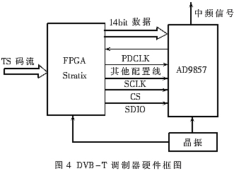 3.3 AD9857内部寄存器 AD9857内部寄存器地址为00h~19h,每个地址存8bit数据。从02h~19h共分为4组相同结构的寄存器,每一组6字节,其中存储DDS的频率控制字,可编程插值滤波器的插值倍数,输出信号幅度的放大因子。00h和01h这两个地址是公用的,包括对AD9857的工作模式、高低位优先、锁相环倍频数、串行口工作模式、自动节能、溢出控制处理和失锁处理等运行方式的设置。用户通过对这些寄存器的设置使AD9857工作在所需要的方式下。 4 系统实现及仿真 4.1 硬件结构 由于AD9857是一个可编程的D/A上变频芯片,因此利用单片机和FPGA都可以实现对它的配置。本系统采用FPGA实现COFDM调制,因此用FPGA去配置AD9857的话,不仅可以节省电路板空间,而且还比较适于调试。 DVB-T调制器的硬件实现框图如图4所示,TS码流进入FPGA后进行COFDM调制,调制后的数据送入AD9857进行中频调制。AD9857配置成功后会产生一个PDCLK返回FPGA,可以使用该时钟把经过信道编码调制的I、Q两路数据送入AD9857进行正交调制。