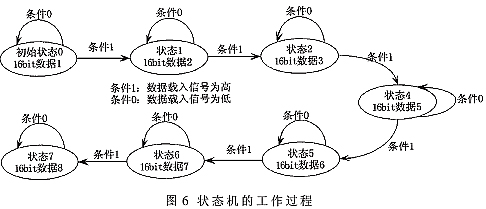 输入到移位寄存器的16bit数据是根据实际需要提前计算好的,这16bit数据包括了8bit的AD9857内部寄存器的地址和要写入该地址的8bit配置字。通过一个状态机的工作机制,在其不同状态,将要写入AD9857内部寄存器的配置字送入移位寄存器。状态机的工作过程如图6所示。