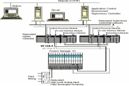 (3)开放性 [1> 集成Honeywell的先前产品:TDC2000,TDC3000,Plantscape,S9000,Logix60 [2> 与PLC通讯(如:SIMENSE,AB,ABB) [3> 与现场总线技术的集成(Profibus-DP,Fieldbus,Modebus,HART等) [4> 标准化的数据访问程序 [5> AEC:高性能服务器,直接与OPC服务器或客户机进行数据交换。 2.2 硬件说明 1)服务器、操作站、打印机等; 服务器通过PCIC卡与下层(SCN)进行数据交换通讯;TC-PCIC01 Typical系统适用于1个server(可冗余)和10-12个station; processor主频 1GHZ; RAM 384MB以上; NETWORK 10Mbps; 显卡 1014×768 65K 硬盘 18.2G 一般选 Dell power 2)SCN 监控层; A、PS (power supply):提供120/240AC给机架,背板,卡件供电。MC-PSRX04 提供卡笼箱的DC电源。TC-FPDXX2 B、CNI (CONTROLNET INTERFACE MODULE);与其它网络层进行通讯的通讯接口。TC-CCR013 C、PM 过程处理器:占两个槽,是控制系统的核心设备,进行数据处理、计算、控制等。TC-PPRS021 D、RM 冗余模件;TC-PRR021 E、IOLIM(I/O LINK INTERFACE MODULE):负责与CPM与PMIOP的通讯;可带电插拔。TC-IOII01 3) Romal I/O A、卡笼箱:file装PMIO的卡笼箱,一般有7,15槽。 B、PMIO (输入输出卡件) 控制站使用的I/O卡件的种类有:HLAI高电平模拟量输入卡(16点)、AO模拟量输出卡(16点)、DI开关量输入卡(32点)、DO开关量输出卡(32点)、LLMUX多路低电平模拟量输入卡(32点)。除控制站本身采用冗余外,控制回路的I/O卡件也采用冗余,大大提高了系统的可靠性。 C、FTA(现场接线端子) MC-TAIH12、MC-TAOY22、MC-TAIH02、MC-TLPA02、MC-TAMR03、MC-TDOY22、MC-TDIY22 2.3 软件说明 (1)control Builder——Control Builder是一种图形化的、面向对象的、基于窗口的工程工具,用于过程系统控制处理器的控制执行环境和应用控制环境的控制策略的设计、组态、和实施。用于组态硬件,如网络、I/O模件、控制器、和现场总线设备,以及组态控制点,如调节控制、设备(马达)控制、逻辑控制、顺序控制和特殊的用户定义的功能等。 (2)QUICK BUilder——QUICK Builder使得用户可以组态第三方的控制器/RTU,以及它们的点、组态操作站和打印机。Quick Builder使用关系数据库引擎,提供筛选数据库的用户显示、多点编辑工具、和直观的窗口风格的用户界面,极大地提高了组态效率。关系数据库还捉供用户自定义的域,可以用来设置终止调度,记录接线编号等,同时还提供标准的报表。ExperiOn PKS过程系统数据库的添加和修改均可以在线进行。 (3)Display Builder ----Display Builder是面向对象的,全集成化的用户画面组态工具,用于生成用户专用的显示图形画面。动态显示可以简单地通过鼠标点击迅速生成。系统还提供一个图形库含有如容器、管道、阀门、罐、马达等通用的工厂设备,帮助用户进一步加快图形设计的速度。此外,对于一些多处用到的相似的画面,可以用模板画面的功能减少组态时间。提供的过程对象和调色板功能可以帮助用户快速简便地创建用户对象,并可以带有三维效果。通过使用脚本程序(VBScript和Jscript)组件,可以显著地增强图形画面功能,如高速动画、工具提示、操作站程序执行的控制作用等都可以通过脚本程序完成。许多ActiveX的组件类型,如播放声音和视频图像等都可以插入在画面中被调用。 (4)Knowledge Builder——Knowledge Builder,在线的电子资料,采用HTML结构的浏览器阅;在线帮助,(F1功能键调用,许多应用予以支持)。 3 系统应用 3.1 17反应釜液位控制 17反应釜是聚酯装置的终缩聚釜,液位的稳定关系到熔体粘度的稳定即产品的最终质量,所以本装置采用了两套放射性液位计,一台靠近入口端LIC17017,另一台靠近出口端LIC17023,17反应釜的液位取三七开,即通过AUX辅助计算块完成0.3*LIC17017.DACA.PV+0.7*LIC17023.DACA.PV的计算作为PID控制块的测量值。通过PID控制块的运算OP输出至SIC16009作为设定值,控制16熔体泵的泵速以调节17反应釜的进料达到液位稳定的目的。 3.2酯化搅拌器联锁控制 在装置中电机12A01带动一酯化搅拌器转动,电机12A01P带动油泵转动来给12A01润滑和冷却。一酯化搅拌器的启动条件是反应釜的液位LIC12019、LIC12009未低低报、油泵12A011已经运行、油压正常(PAL12036未低报),所以两个电机的启停顺序应该是先开油泵12A01P,再开搅拌器12A01,停止时先停12A01再停12A01P;另外,为保护搅拌器12A01,在一酯化液位计LC12019、12009液位低低报时、在12A01P故障停止时应联锁停止12A01。系统使用了一个DEVICE块简单、方便地实现了以上功能,示意图如图3所示。 DEVICE块是一种多输入多输出点,它提供对马达、泵、开关阀等离散型设备的操作控制面板。所用两个DC点的状态,S0是停止状态、S1是运行状态,连接着2个输出和2个输入。12A01的输出启动信号(S1)是DO点12A01T,输出停止信号(S0) 是DO点12A01P;反馈输入信号DI点是12A01I、12A01F,均为1时表示12A01已运转,12A01I为0、12A01P为1时表示其已停止。 12A01启动的允许条件是PI(1)为1,即液位计未低报、油压未低报及油泵已经启动三个条件均满足。在液位低报时,12A01¬-ANDA.OUT为1,使12A01P动作停12A01。 4、结束语 PKS控制系统强大的功能模块和其优越性能保证了装置按照设计方案在预定时间内顺利开车。该PKS系统自2004年12月投用以来,系统运行稳定,没有因DCS系统本身的问题对生产造成过影响,而且由于该系统的开放性、灵活性、易操作性等优越性能,能够根据生产需要自主的进行一些过程点的组态操作,如一些控制方案的增改、联锁关系的变动,都能够在不影响正常生产的前提下在线修改。 |