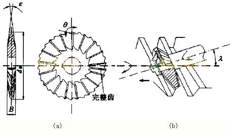 - 盘形螺纹铣刀如图1(a)所示,工作时,铣刀轴线和工件轴线倾斜一个工件螺纹中径导程角入,工件旋转一周,工件和铣刀相对在轴向移动一个螺距。通常一次走刀即能切出所需螺纹,工作简图如图1(b)所示。为了提高铣削平稳性,齿数应取多齿,且做成错齿形式,以改善两侧刃的切削条件。