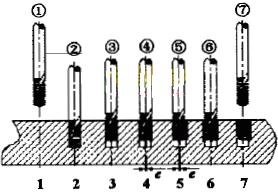 - 梳形螺纹铣刀可以看作是若干个盘形螺纹铣刀的组合,如图2所示。加工时,铣刀和工件轴线平行,且铣刀和工件沿螺纹全长接触。因此,切削时工件旋转一周,工件和铣刀相对轴向移动一个螺距,即能切出所需螺纹。