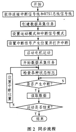 3 运动控制与数据采集的同步 测试系统中采取的同步方式一般有二种:一种是运动控制卡控制电机运动到某个指定位置,数据采集卡能实时采集该位置上的数据,这种方式称为中断;另一种同步方式是如果电机运动到某个位置时数据采集卡采集到满足某种条件的信号,则需要记录电机当前的运动位置,这种方式称为捕获。本文主要讨论中断同步方式。 3.1 中断方式 中断分为绝对位置中断、相对位置中断及周期性位置中断。绝对位置中断是指当电机运动到某绝对位置时运动控制卡将产生外部中断信号;相对位置中断是指当电机的运动位置相对于允许电机产生中断时的位置之差满足设定的条件时产生中断信号;求模位置中断是指每相对于某个设定的位置都将产生1个中断信号。因此可以根据测试系统的不同需要决定采取什么样的中断方式。 3.2 同步的原理 当运动控制卡控制电机运动到某个位置时,编码器上返回的位置信号一旦符合设定的位置条件,将发出1个中断信号。该信号可作为数据采集卡采集信号的触发条件,使采集卡能实时采集所需数据。运动控制卡和数据采集卡可以通过RTSI总线实现二者之间的同步。运动控制卡产生的中断信号通过内部电路传送到RTSI输出引脚,目前RTSI输出引脚主要有7个(RTSIO-RTSl6)。RPSI输出引脚可通过外部电缆与数据采集卡的RTSI引脚相连。采集卡的RTSI引脚也可以通过内部电路与其控制信号(见图1)相连,从而实现二者之间的同步。 当运动控制卡控制电机运动到某个指定位置时将产生中断信号,该中断输出信号可连接到运动控制卡的RTSI引脚,运动控制卡的RTSI引脚与数据采集卡的RTSI引脚相连。而在采集卡内,RTSI引脚信号作为系统的扫描时钟,与采样时钟信号相连,因此运动控制卡每产生1个中断信号,数据采集卡便进行1次通道扫描,读取各个传感器上采集的数据。该数据将存放在设置的缓冲区中。而一旦缓冲区中的数据已满,则通过多线程的方式显示到屏幕上。这样就实现了运动控制和数据采集之间的同步。 4 编程实现 运动控制与数据采集的同步控制流程如图2所示。
