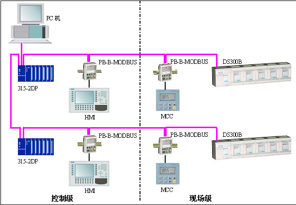 | 上海某污水处理厂处理能力在1万m3/日,监控点数不是很多,选用S7-300 PLC加北京鼎实DS300B分布式IO是一种即经济又切合实际的解决方案,它具有高度模块化结构,能够满足多样化和个性化的需求。 一、自控系统的硬件选择 污水处理主要是顺序逻辑控制,这正是PLC控制的优势所在。在此工程中,PROFIBUS主站选S7-300 PLC,分布式IO选用北京鼎实公司DS300B系列分布式IO。DS300B系列是可扩展模块。PROFIBUS通讯适配器CC-PB-1.0带有标准PROFIBUS-DP接口,开关量、模拟量模块通过冗余的CAN BUS进行扩展,最多可以扩展16个模块。各种单独的模块之间可进行广泛的组合以用于扩展。人机界面选用昆仑通态品牌,并配北京鼎实公司的PROFIBUS转MODBUS桥接模块,使昆仑通态HMI连接到DP总线上。 二、总体控制要求及功能 污水处理厂自控系统的要求是对污水处理过程进行自动控制和自动调节,使处理后的水质指标达到要求的范围;在中控室发出上传指令时,将当前时刻运行过程中的主要工作参数(水质参数、流量、液位等)、运行状态及一定时间段内的主要工艺过程曲线等信息上传到中控室。功能如下: (1)控制操作: 在中心控制室能对被控设备进行在线实时控制,如启停某一设备,调节某些模拟输出量的大小,在线设置PLC的某些参数等。 (2)显示功能: 用图形实时地显示各现场被控设备的运行工况,以及各现场的状态参数。 (3)数据管理: 依据不同运行参数的变化快慢和重要程度,建立生产历史数据库,存储生产原始数据,供统计分析使用。利用实时数据库和历史数据库中的数据进行比较和分析,得出一些有用的经验参数,有利于优化曝气池的准闭环控制,并把一些必要的参数和结果显示到实时画面和报表中去。 (4)报警功能: 当某一模拟量(如电流、压力、水位等)测量值超过给定范围或某一开关量(如电机启停、阀门开关)阀发生变位时,可根据不同的需要发出不同等级的报警。 (5)打印功能: 可以实现报表和图形打印以及各种事件和报警实时打印。打印方式可分为:定时打印、事件触发打印。 三、系统构成及其布局 如果采用常规集中控制方式,将现场信号通过电缆连接到集中控制室内的PLC上,由于工艺线路长、现场控制点分布范围广,需要敷设大量的电缆及桥架,且现场环境恶劣、施工难度非常大。鉴于此,采用了PROFIBUS现场总线技术,根据工艺划分,系统共设了两个主站、两个子站、两个操作员站。主站采用CPU315-2DP,子站采用北京鼎实公司DS300B系列分布式IO远程模块,用于现场数据的采集和控制,并借助PROFIBUS(工业现场总线),方便控制网络系统的建立。其自控系统见下图: