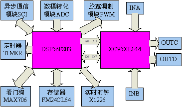 2.1核心芯片介绍 本文采用的DSP是DSP56800系列数字信号处理器中的DSP56F803。DSP56800系列采用哈佛结构,将程序空间和地址空间分开编址,这样在DSP电力电子应用平台处理数据空间运算与数据传输的同时可以并行的从程序空间读取下一条指令,提高处理速度。DSP56800系列数字信号处理器具有丰富的I/O口和多种外围设备。DSP芯片上集成了通用输入输出模块GPIO、异步串行通信模块SCI、脉宽调制模块PWM、模数转换模块ADC、同步串行通信模块SSI、控制局域网模块CAN2.0A/B、定时器模块TIMER等多种外设模块,实现完全的单片化。 XC95XL144是Xilinx公司推出的一款高性能低电压的可编程逻辑器件,它共有100 个引脚,内部集成了3200个典型可用门,有144个逻辑单元,74个可用I/O口,可单独配置为输入、输出及双向工作方式,3个全局时钟及3个全局使能端和1个全局清除端,它支持3.3V和2.5V电压工作,其传输延时仅为5 ns。同时,XC95XL144支持在线编程,程序通过JTAG接口下载,使用简单方便。 2.2 DSP56F803通用板主要功能模块的设计 2.2.1脉宽调制模块PWM。PWM模块主要用于电力电子变流器DSP电力电子应用平台开关器件的控制以及各种电机控制。模块有六路输出通道,它们可以根据需求在软件中被配置成3对互补对;2对互补对和2路独立通道;1对互补对和4路独立通道;6路独立通道。在互补操作方式下,允许可编程死区时间的插入,以防止上下桥臂的贯穿短路。PWM的频率和占空比连续可调,通过电流传感器的输出波形扭曲校正和独立得顶、底输出DSP电力电子应用平台引脚极性控制,可以实现无级变频。 2.2.2 模数转换模块ADC。ADC可以用于采样各种电流、电压、转速等信号。ADC包括8路输入通道和两个独立的采样保持电路,转换精度为12位。转换过程可以被同步信号触发,也可以被控制寄存器的START位写操作触发。输入模式可以分为单边输入和差分输入。 2.2.3 串行通信模块SCI。SCI是全双工异步通讯接口,使用标准不归零NRZ数据格式,可编程选择8位或9位数据格式,功能独立的SCI发送器和接收器以及中断请求。虽然大多数PC机都采用RS-232接口,但是它的传输距离只有50英尺左右,通用板采用RS-485差分通信,提高抗干扰能力,最大传输距离可以达到4000英尺以上,适用于远程监控。这样PC机或其它DSP板就可以通过隔离的485与通用板进行通信了。 2.2.4 定时器模块TIMER。定时器的两个主要功能:定时触发一定的事件;记录两个外部事件之间所经历的内部时钟周期数,也就是得到外部事件的时间周期。因此接口可用于各种信号的过零点检测,用于并网运行的各种装置时,可以检测电网的过零点和周期。 2.2.5 由于电力电子一般只需要故障数据,本文就没有通过总线外扩存储器,只通过两个通用输入/输出口扩展了64K铁电非易失性存储器FM24CL64。FM24CL64是8192x8bit的结构,允许连续读写和随机读写,读写没有延迟,高可靠性的铁电物质,存储时间长到45年。本文还扩展了实时时钟X1226,这样在记录故障数据的同时记录故障发生的时间,以便分析故障时使用。X1226带有两个报警器和512字节的电可擦除只读寄存器,内部集成晶振补偿电路和电池后备,编程可以控制PHZ/IRQ引脚输出报警信号或与时钟频率相关的三种不同频率的信号。 2.2.6为了防止电源低电压,本文采用了电源电压监测芯片MAX706RESA,它检测电路在上电和电源电压低时都发出复位信号使整个系统复位,同时还具有看门狗定时器功能,在1.6s内DSP的WDI引脚电平不翻转,就会给DSP发一个可靠复位信号,增强了抗干扰能力。 2.3 DSP56F803与XC95XL144的接口的设计 本文在安排XC95XL144引脚时遵循的主要原则是电气特性相似的同一组输入输出口尽量放在同一个宏单元,排列顺序根据布线方便为原则。通用板DSP56F803与XC95XL144的接口包括:数据选择线DS、低位数据线D0-D7、低位地址线A0-A3以及A6 作为XC95XL144的复位控制端、六路PWM输出信号以及三路出错保护引脚PWMFAULTA0- PWMFAULTA2、外中断IRQA和IRQB。这里只介绍一下XC95XL144的通用功能,其它具体的功能要根据具体的电力电子应用需求来修改VHDL语言程序。 DSP56F803的地址线A6模式设置为通用输入输出口,作为XC95XL144的复位控制RESET,当RESET置低时,XC95XL144复位,输出口置为低电平(高电平有效)。DSP56F803的六路PWM输出作为XC95XL144的输入与它连接,对应有六个输出口,可对它们进行一定的逻辑操作后输出,这样可应用于更广泛的控制场合。电力电子主电路部分的过压、过流信号输入到CPLD,经过一定的逻辑,触发DSP外中断IRQA、IRQB或PWM出错保护引脚PWMFAULT来实现保护功能。DSP56F803的数据选择线DS连在XC95XL144,与低位地址线配合,控制4组每组8路输入输出口的读写操作。在使用输入输出口时一般都确定了具体是输入还是输出,因此本文设计时为提高稳定性,确定其中两组输入口和两组输出口。 3 软件设计 对于DSP56800系列产品,Motorola提供两种软件开发工具:一个是Codewarrior集成开发环境,是一种可靠的用语交叉汇编、交叉C编译、链接和调试的开发工具。Metrowerks公司属Motorola,它的Codewarrior集成开发环境包含了一个可视化的工程创建和管理系统,对源代码文件和库进行全面的管理,降低了工程的复杂性。另外一种是软件开发工具Embedded SDK,它并不是DSP开发必需的,但是它可以大大的减轻开发工作的难度,加快开发的速度。对于DSP外设的各模块的子程序的编写采用Embedded SDK很容易掌握,这里就不详