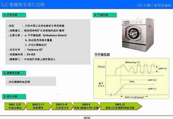 | 1.开发内容 -目标:开发中国工业用洗涤机专用变频器 -战略意义:继续维持和扩大该领域的成功案例 -主要内容: a.不平衡检测(Unbalance Detect) b.自动检查洗涤水重量 c.欠电压限制运行 -变频器种类:SV-iS5 -提案部门:中国地区本部上海贸易法人 2.突破性发展 -无传感器转矩反馈